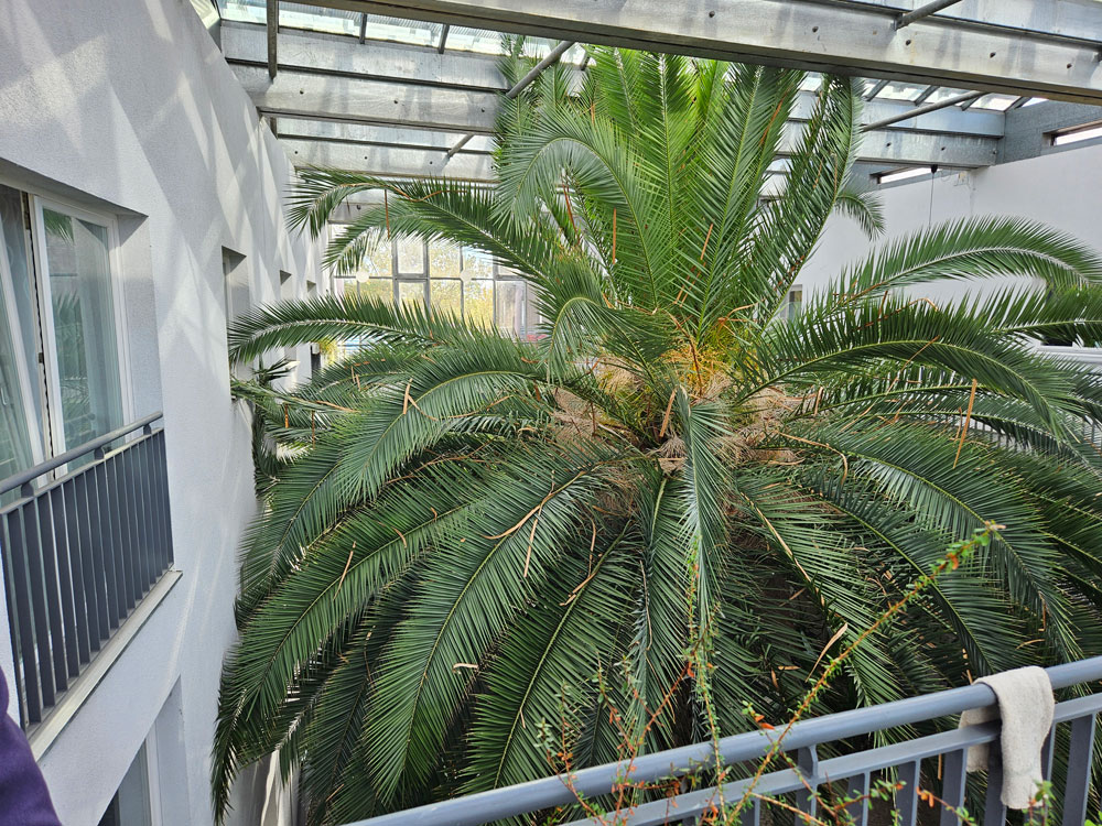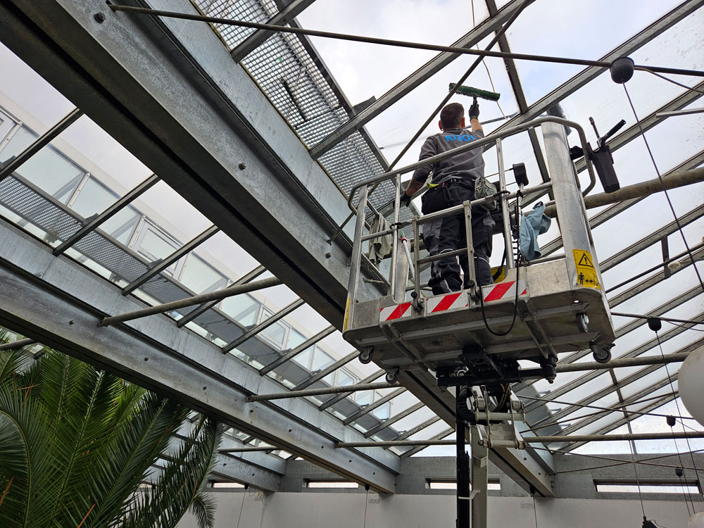 Die Herausforderung lag woanders, nämlich bei der Reinigung des Glasdachs unterseitig: Denn mitten im hellen lichtdurchfluteten Innenhof stand eine riesige Palme, die nahezu den kompletten Innenraum ausfüllte. Zudem war die Zugangstür zum Innenhof nur 1,20 Meter breit und 2,20 Meter hoch.